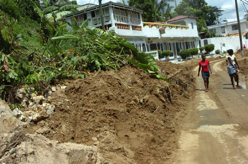 Norman Grindley /Acting Photography Editor Residents of Glengoffe St. Catherine make their way along the main road in the parish yesterday. The town was covered with mud from land slide cause from heavy rain last week.