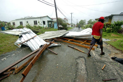Ricardo Makyn/Staff Photographer. A resident walks by whats left of a Roof that was blown off due to the powerful Winds from Gustav in Long Bay Portland.